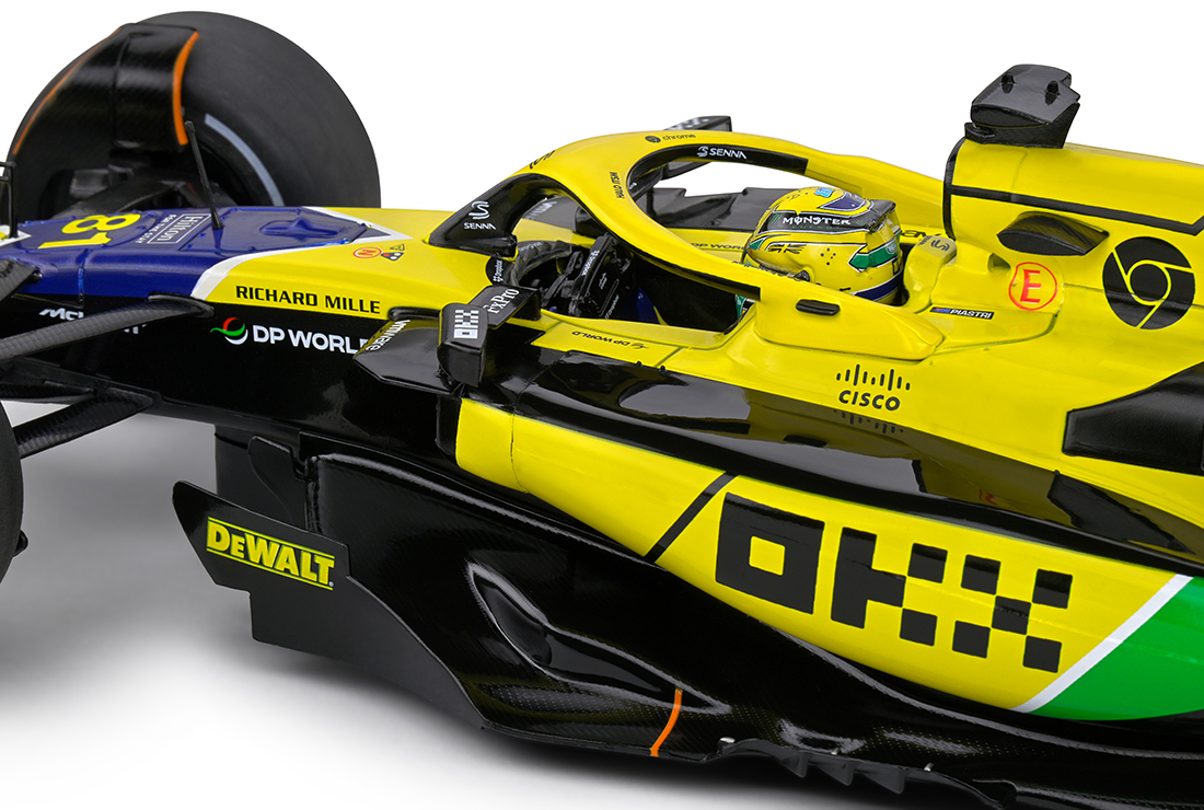 McLaren MCL38 n°81 du team "Mclaren Formula 1 Team" de Oscar Piastri lors du Grand Prix de Monaco 2024 (2ème). Décoration en hommage à Ayrton Senna.